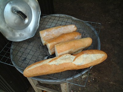 フランスパンサンドを注文すると、まず、炭火で表面をあぶりながら、パン全体を温めてくれます。その後、好みの具をサンドしてくれます。